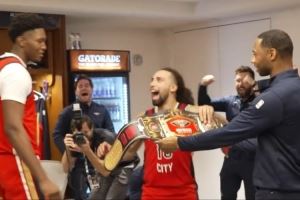赛后,鹈鹕众将在更衣室开心庆祝,阿尔瓦拉多接过主帅威利·格林递过来的金腰带,将其颁给了奎因。