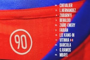 30-舍瓦利耶 、21-卢卡斯、6-扎巴尔尼、4-贝拉尔多、33-埃梅里、8-法比安、19-李刚仁、17-维蒂尼亚、29-巴尔科拉、9-贡萨洛-拉莫斯、49-姆巴耶