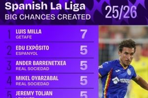 西甲创造进球机会排行:拉菲尼亚、居勒尔4次并列第六